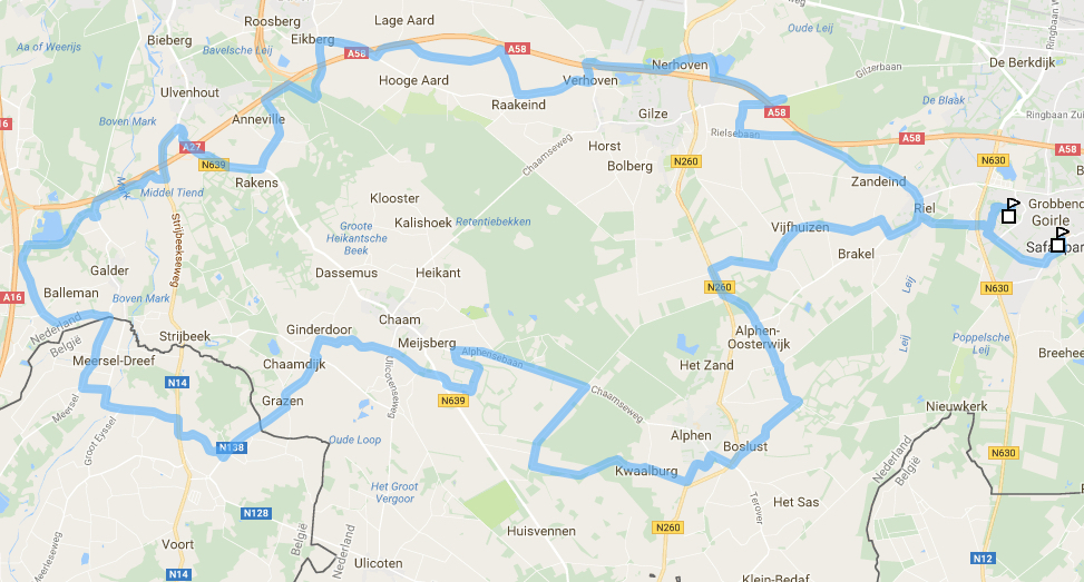 Klassieke rit via Riel, Alphen, Chaam, Strijbeek, Meerseldreef, Ulvenhout, Breda, Bavel, Gilze en door Riel terug naar Goirle. |