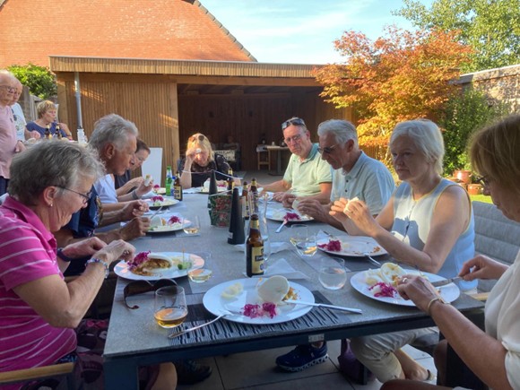 Hoofdgerecht bij Raymond en Annemarie en het toetje van Henk en Lisette Dan moest het hoofdgerecht nog komen bij Raymond en Annemarie. Een niet alledaags gerecht; broodje Bapao met rendang geserveerd met witte en rode kool in het zuur. Het was echt om te smullen. De laatste etappe voerde de deelnemers langs de Beekse Bergen terug naar resort Strijbosch waar de fietsers nog een heerlijk toetje stond te wachten en Paul inmiddels de muziek had verzorgd. Niet een maar drie verschillende toetjes. Ananas bavarois, hemelse modder en panna cotta met zomers fruit waren met zeer veel zorg bereid door Henk en Lisette.